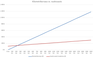 Laskelmiemme* mukaan vuokra-auto onkin kilometrikorvausta kustannustehokkaampi vaihtoehto jo noin 250 kilometrin ajon jälkeen, riippuen toki vuokra-auton hinnasta.